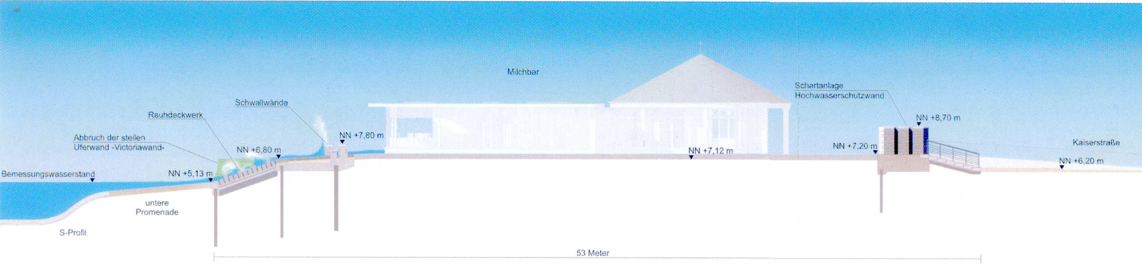 Die nicht ausreichend wehrhaften Stützwände unter der Marienhöhe und der Milchbar werden durch ein schweres Deckwerk aus Granitsteinen mit oberhalb angrenzender Promenade ersetzt. Dieses wird mit seiner Fertigstellung optisch durchgängig den Charakter des neuen Deckwerkes bis hin zum Café am Nordstrand prägen.