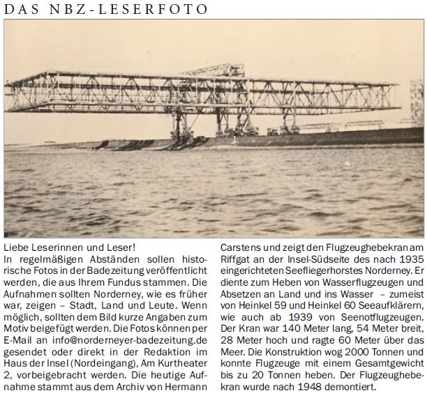 Die heutige Aufnahme stammt aus dem Archiv von Hermann Carstens und zeigt den Flugzeughebekran am Riffgat an der Insel-Südseite des nach 1935 eingerichteten Seefliegerhorstes Norderney. Er diente zum Heben von Wasserflugzeugen und Absetzen an Land und ins Wasser - zumeist von Heinkel 59 und Heinkel 60 Seeaufklärern, wie auch ab 1939 von Seenotflugzeugen. Der Kran war 140 Meter lang, 54 Meter breit, 28 Meter hoch und ragte 60 Meter über das Meer. Die Konstruktion wog 2.000 Tonnen und konnte Flugzeuge mit einem Gesamtgewicht bis zu 20 Tonnen heben. Der Flugzeughebekran wurde nach 1948 demontiert.