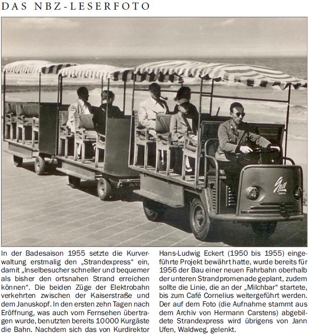 In der Badesaison 1955 setzte die Kurverwaltung erstmalig den "Strandexpress" ein, damit "Inselbesucher schneller und bequemer als bisher den ortsnahen Strand erreichen können". Die beiden Züge der Elektrobahn verkehrten zwischen der Kaiserstraße und dem Januskopf. In den ersten zehn Tagen nach Eröffnung, was auch vom Fernsehen übertragen wurde, benutzten bereits 10.000 Kurgäste die Bahn. Nachdem sich das von Kurdirektor Hans-Ludwig Eckert (1950 bis 1955) eingeführte Projekt bewährt hatte, wurde bereits für 1956 der Bau einer neuen Fahrbahn oberhalb der unteren Strandpromenade geplant, zudem sollte die Linie, die an der "Milchbar" startete, bis zum Café Cornelius weitergeführt werden. Der auf dem Foto (die Aufnahme stammt aus dem Archiv von Hermann Carstens) abgebildete Strandexpress wird übrigens von Jann Ufen, Waldweg, gelenkt.