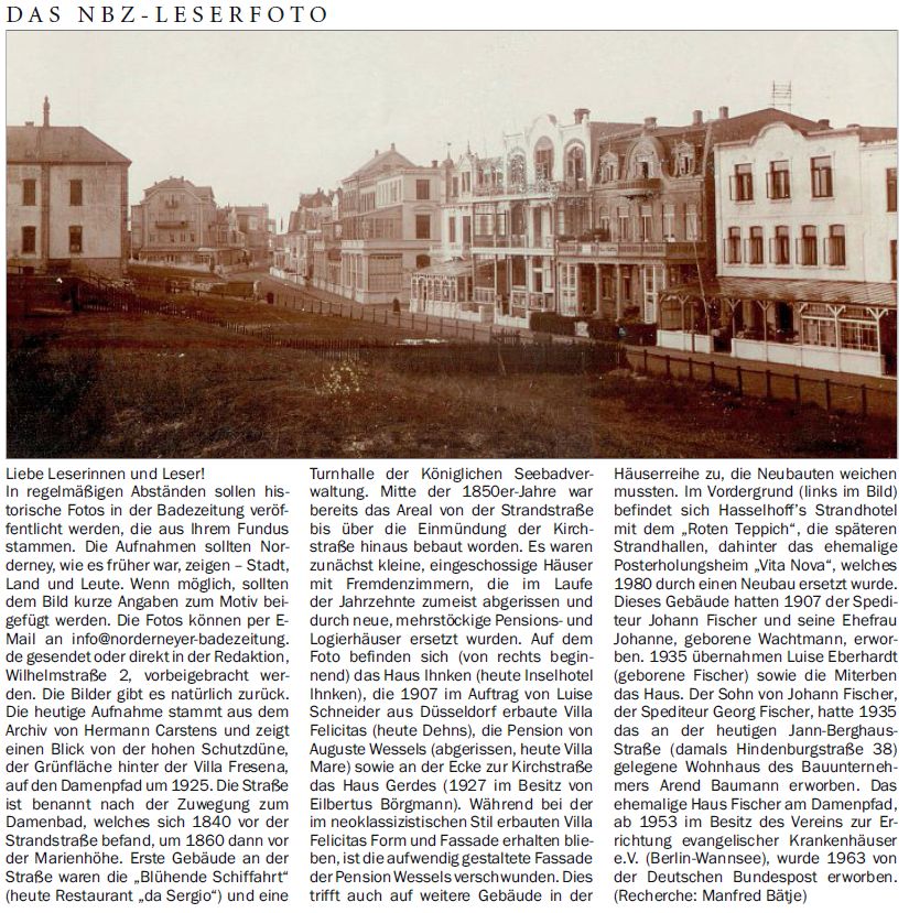 Die heutige Aufnahme stammt aus dem Archiv von Hermann Carstens und zeigt einen Blick von der hohen Schutzdüne, der Grünfläche hinter der Villa Fresena, auf den Damenpfad um1925. Die Straße ist benannt nach der Zuwegung zum Damenbad, welches sich 1840 vor der Strandstraße befand, um 1860 dann vor der Marienhöhe. Erste Gebäude an der Straße waren die "Blühende Schiffahrt" (heute Restaurant "da Sergio") und eine Turnhalle der Königlichen Seebadverwaltung. Mitte der 1850er-Jahre war bereits das Areal von der Strandstraße bis über die Einmündung der Kirchstraße hinaus bebaut worden. Es waren zunächst kleine, eingeschossige Häuser mit Fremdenzimmern, die im Laufe der Jahrzehnte zumeist abgerissen und durch neue, mehrstöckige Pensions- und Logierhäuser ersetzt wurden. Auf dem Foto befinden sich (von rechts beginnend) das Haus Ihnken (heute Inselhotel Ihnken), die 1907 im Auftrag von Luise Schneider aus Düsseldorf erbaute Villa Felicitas (heute Dehns), die Pension von Auguste Wessels (abgerissen, heute Villa Mare) sowie an der Ecke zur Kirchstraße das Haus Gerdes (1927 im Besitz von Eilbertus Börgmann). Während bei der im neoklassizistischen Stil erbauten Villa Felicitas Form und Fassade erhalten blieben, ist die aufwendig gestaltete Fassade der Pension Wessels verschwunden. Dies trifft auch auf weitere Gebäude in der Häuserreihe zu, die Neubauten weichen mussten. Im Vordergrund (links im Bild) befindet sich Hasselhoff’s Strandhotel mit dem "Roten Teppich", die späteren Strandhallen, dahinter das ehemalige Posterholungsheim "Vita Nova", welches 1980 durch einen Neubau ersetzt wurde. Dieses Gebäude hatten 1907 der Spediteur Johann Fischer und seine Ehefrau Johanne, geborene Wachtmann, erworben. 1935 übernahmen Luise Eberhardt (geborene Fischer) sowie die Miterben das Haus. Der Sohn von Johann Fischer, der Spediteur Georg Fischer, hatte 1935 das an der heutigen Jann-Berghaus-Straße (damals Hindenburgstraße 38) gelegene Wohnhaus des Bauunternehmers Arend Baumann erworben. Das ehemalige Haus Fischer am Damenpfad, ab 1953 im Besitz des Vereins zur Errichtung evangelischer Krankenhäuser e.V. (Berlin-Wannsee), wurde 1963 von der Deutschen Bundespost erworben. (Recherche: Manfred Bätje)