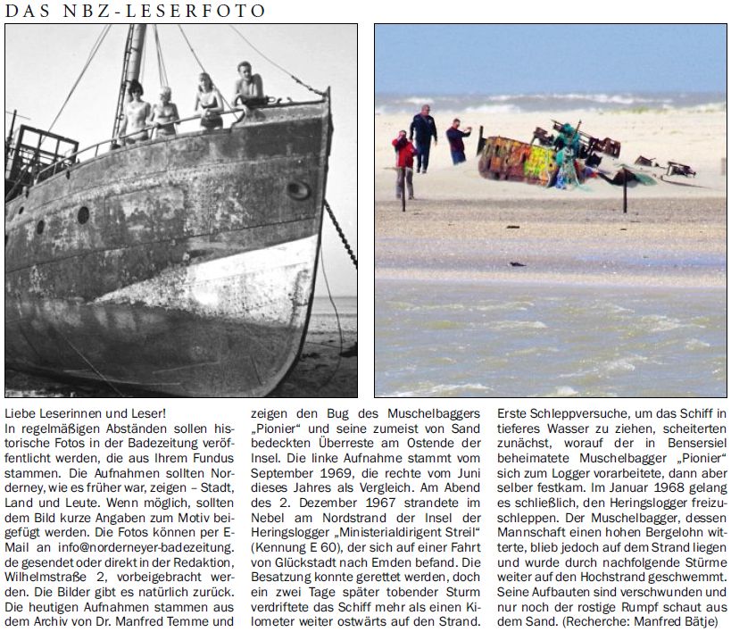 Die heutigen Aufnahmen stammen aus dem Archiv von Dr. Manfred Temme und zeigen den Bug des Muschelbaggers "Pionier" und seine zumeist von Sand bedeckten Überreste am Ostende der Insel. Die linke Aufnahme stammt vom September 1969, die rechte vom Juni dieses Jahres als Vergleich. Am Abend des 2. Dezember 1967 strandete im Nebel am Nordstrand der Insel der Heringslogger "Ministerialdirigent Streil" (Kennung E 60), der sich auf einer Fahrt von Glückstadt nach Emden befand. Die Besatzung konnte gerettet werden, doch ein zwei Tage später tobender Sturm verdriftete das Schiff mehr als einen Kilometer weiter ostwärts auf den Strand. Erste Schleppversuche, um das Schiff in tieferes Wasser zu ziehen, scheiterten zunächst, worauf der in Bensersiel beheimatete Muschelbagger "Pionier" sich zum Logger vorarbeitete, dann aber selber festkam. Im Januar 1968 gelang es schließlich, den Heringslogger freizuschleppen. Der Muschelbagger, dessen Mannschaft einen hohen Bergelohn witterte, blieb jedoch auf dem Strand liegen und wurde durch nachfolgende Stürme weiter auf den Hochstrand geschwemmt. Seine Aufbauten sind verschwunden und nur noch der rostige Rumpf schaut aus dem Sand. (Recherche: Manfred Bätje)