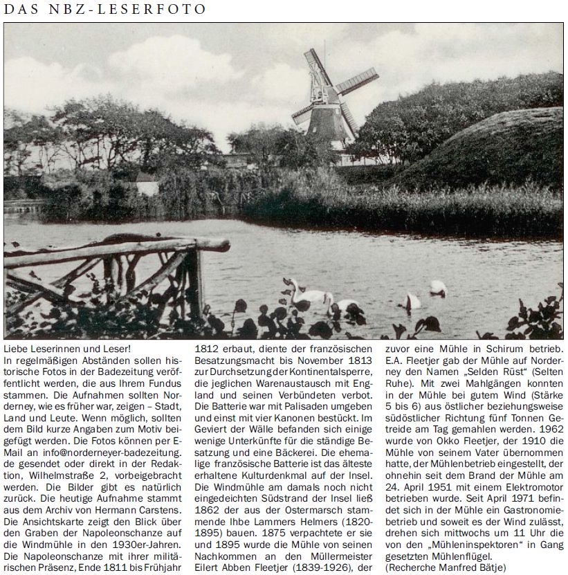 Die heutige Aufnahme stammt aus dem Archiv von Hermann Carstens. Die Ansichtskarte zeigt den Blick über den Graben der Napoleonschanze auf die Windmühle in den 1930er-Jahren. Die Napoleonschanze mit ihrer militärischen Präsenz, Ende 1811 bis Frühjahr 1812 erbaut, diente der französischen Besatzungsmacht bis November 1813 zur Durchsetzung der Kontinentalsperre, die jeglichen Warenaustausch mit England und seinen Verbündeten verbot. Die Batterie war mit Palisaden umgeben und einst mit vier Kanonen bestückt. Im Geviert der Wälle befanden sich einige wenige Unterkünfte für die ständige Besatzung und eine Bäckerei. Die ehemalige französische Batterie ist das älteste erhaltene Kulturdenkmal auf der Insel. Die Windmühle am damals noch nicht eingedeichten Südstrand der Insel ließ 1862 der aus der Ostermarsch stammende Ihbe Lammers Helmers (1820-1895) bauen. 1875 verpachtete er sie und 1895 wurde die Mühle von seinen Nachkommen an den Müllermeister Eilert Abben Fleetjer (1839-1926), der zuvor eine Mühle in Schirum betrieb. E.A. Fleetjer gab der Mühle auf Norderney den Namen "Selden Rüst" (Selten Ruhe). Mit zwei Mahlgängen konnten in der Mühle bei gutem Wind (Stärke 5 bis 6) aus östlicher beziehungsweise südöstlicher Richtung fünf Tonnen Getreide am Tag gemahlen werden. 1962 wurde von Okko Fleetjer, der 1910 die Mühle von seinem Vater übernommen hatte, der Mühlenbetrieb eingestellt, der ohnehin seit dem Brand der Mühle am 24. April 1951 mit einem Elektromotor betrieben wurde. Seit April 1971 befindet sich in der Mühle ein Gastronomiebetrieb und soweit es der Wind zulässt, drehen sich mittwochs um 11 Uhr die von den "Mühleninspektoren" in Gang gesetzten Mühlenflügel. (Recherche Manfred Bätje)