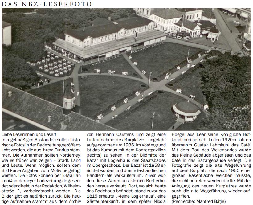 Die heutige Aufnahme stammt aus dem Archiv von Hermann Carstens und zeigt eine Luftaufnahme des Kurplatzes, ungefähr aufgenommen um 1936. Im Vordergrund ist das Kurhaus mit dem Konzertpavillon (rechts) zu sehen, in der Bildmitte der Bazar mit Logierhaus des Staatsbades im Obergeschoss. Der Bazar ist 1858 errichtet worden und diente festländischen Händlern als Verkaufsraum. Zuvor wurden diese Waren aus kleinen Bretterbuden heraus verkauft. Dort, wo sich heute das Badehaus befindet, stand zuvor das 1815 erbaute "Kleine Logierhaus", eine Gästeunterkunft, in dem später Nicola Hoegel aus Leer seine Königliche Hofkonditorei betrieb. In den 1920er-Jahren übernahm Gustav Lehmkuhl das Café. Mit dem Bau des Wellenbades wurde das kleine Gebäude abgerissen und das Café in das Bazargebäude verlegt. Die Fotografie zeigt die alte Wegeführung auf dem Kurplatz, die nach 1950 einer großen Rasenfläche weichen musste, die nicht betreten werden durfte. Mit der Anlegung des neuen Kurplatzes wurde auch die alte Wegeführung wieder aufgegriffen. (Recherche: Manfred Bätje)