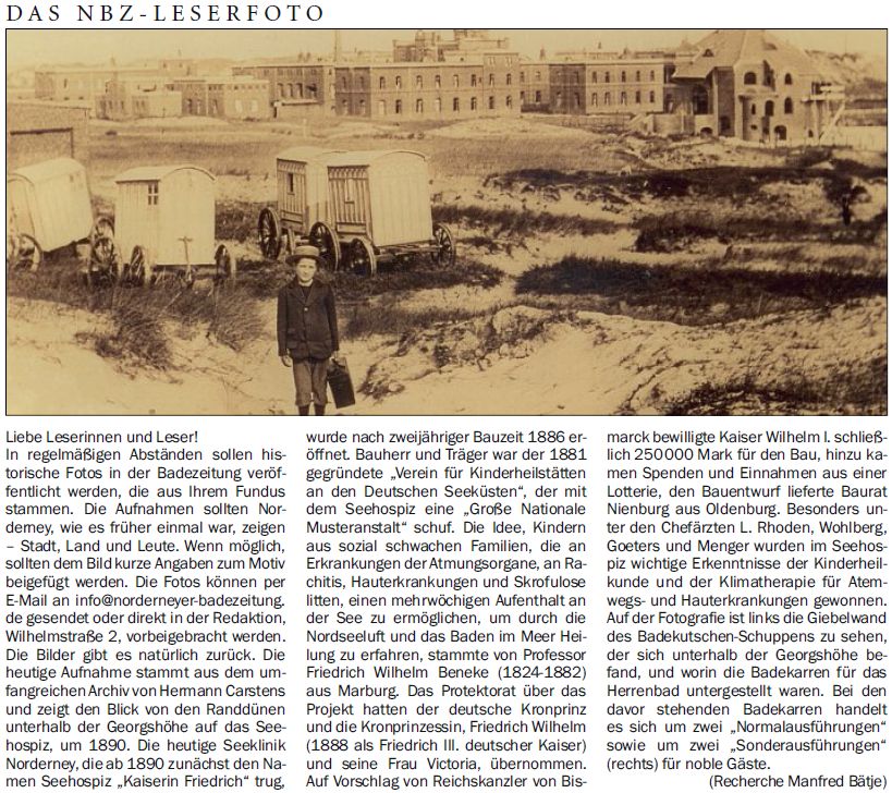 Die heutige Aufnahme stammt aus dem umfangreichen Archiv von Hermann Carstens und zeigt den Blick von den Randdünen unterhalb der Georgshöhe auf das Seehospiz, um 1890. Die heutige Seeklinik Norderney, die ab 1890 zunächst den Namen Seehospiz "Kaiserin Friedrich" trug, wurde nach zweijähriger Bauzeit 1886 eröffnet. Bauherr und Träger war der 1881 gegründete "Verein für Kinderheilstätten an den Deutschen Seeküsten", der mit dem Seehospiz eine "Große Nationale Musteranstalt" schuf. Die Idee, Kindern aus sozial schwachen Familien, die an Erkrankungender Atmungsorgane, an Rachitis, Hauterkrankungen und Skrofulose litten, einen mehrwöchigen Aufenthalt an der See zu ermöglichen, um durch die Nordseeluft und das Baden im Meer Heilung zu erfahren, stammte von Professor Friedrich Wilhelm Beneke (1824-1882) aus Marburg. Das Protektorat über das Projekt hatten der deutsche Kronprinz und die Kronprinzessin, Friedrich Wilhelm (1888 als Friedrich III. deutscher Kaiser) und seine Frau Victoria, übernommen. Auf Vorschlag von Reichskanzler von Bismarck bewilligte Kaiser Wilhelm I. schließlich 250.000 Mark für den Bau, hinzu kamen Spenden und Einnahmen aus einer Lotterie, den Bauentwurf lieferte Baurat Nienburg aus Oldenburg. Besonders unter den Chefärzten L. Rhoden, Wohlberg, Goeters und Menger wurden im Seehospiz wichtige Erkenntnisse der Kinderheilkunde und der Klimatherapie für Atemwegs- und Hauterkrankungen gewonnen. Auf der Fotografie ist links die Giebelwand des Badekutschen-Schuppens zu sehen, der sich unterhalb der Georgshöhe befand, und worin die Badekarren für das Herrenbad untergestellt waren. Bei den davor stehenden Badekarren handelt es sich um zwei "Normalausführungen" sowie um zwei "Sonderausführungen" (rechts) für noble Gäste. (RechercheManfred Bätje)