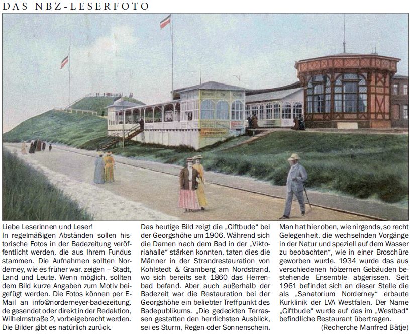 Das heutige Bild zeigt die "Giftbude" bei der Georgshöhe um 1906. Während sich die Damen nach dem Bad in der "Viktoriahalle" stärken konnten, taten dies die Männer in der Strandrestauration von Kohlstedt & Gramberg am Nordstrand, wo sich bereits seit 1860 das Herrenbad befand. Aber auch außerhalb der Badezeit war die Restauration bei der Georgshöhe ein beliebter Treffpunkt des Badepublikums. "Die gedeckten Terrassen gestatten den herrlichsten Ausblick, sei es Sturm, Regen oder Sonnenschein. Man hat hier oben, wie nirgends, so recht Gelegenheit, die wechselnden Vorgänge in der Natur und speziell auf dem Wasser zu beobachten", wie in einer Broschüre geworben wurde. 1934 wurde das aus verschiedenen hölzernen Gebäuden bestehende Ensemble abgerissen. Seit 1961 befindet sich an dieser Stelle die als "Sanatorium Norderney" erbaute Kurklinik der LVA Westfalen. Der Name "Giftbude" wurde auf das im "Westbad" befindliche Restaurant übertragen. (Recherche Manfred Bätje)