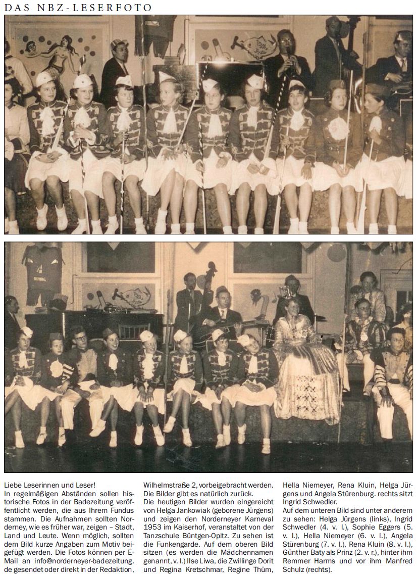 Die heutigen Bilder wurden eingereicht von Helga Jankowiak (geborene Jürgens) und zeigen den Norderneyer Karneval 1953 im Kaiserhof, veranstaltet von der Tanzschule Büntgen-Opitz. Zu sehen ist die Funkengarde. Auf dem oberen Bild sitzen es werden die Mädchennamen genannt, v. l.) Ilse Liwa, die Zwillinge Dorit und Regina Kretschmar, Regine Thüm, Hella Niemeyer, Rena Kluin, Helga Jürgens und Angela Stürenburg. rechts sitzt Ingrid Schwedler. Auf dem unteren Bild sind unter anderem zu sehen: Helga Jürgens (links), Ingrid Schwedler (4. v. l.), Sophie Eggers (5. v. l.), Hella Niemeyer (6. v. l.), Angela Stürenburg (7. v. l.), Rena Kluin (8. v. l.), Günther Barty als Prinz (2. v. r.), hinter ihm Remmer Harms und vor ihm Manfred Schulz (rechts).