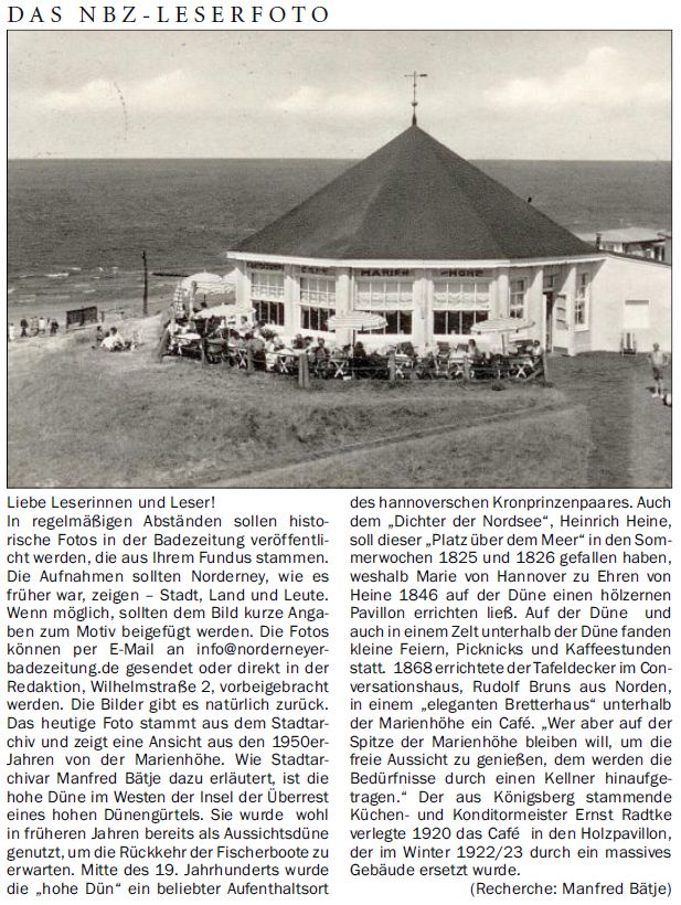 genutzt, um die Rückkehr der Fischerboote zu erwarten. Mitte des 19. Jahrhunderts wurde die "hohe Dün" ein beliebter Aufenthaltsort des hannoverschen Kronprinzenpaares. Auch dem "Dichter der Nordsee", Heinrich Heine, soll dieser "Platz über dem Meer" in den Sommerwochen 1825 und 1826 gefallen haben, weshalb Marie von Hannover zu Ehren von Heine 1846 auf der Düne einen hölzernen Pavillon errichten ließ. Auf der Düne und auch in einem Zelt unterhalb der Düne fanden kleine Feiern, Picknicks und Kaffeestunden statt. 1868 errichtete der Tafeldecker im Conversationshaus, Rudolf Bruns aus Norden, in einem "eleganten Bretterhaus" unterhalb der Marienhöhe ein Café. "Wer aber auf der Spitze der Marienhöhe bleiben will, um die freie Aussicht zu genießen, dem werden die Bedürfnisse durch einen Kellner hinaufgetragen." Der aus Königsberg stammende Küchen- und Konditormeister Ernst Radtke verlegte 1920 das Café in den Holzpavillon, der im Winter 1922/23 durch ein massives Gebäude ersetzt wurde. (Recherche: Manfred Bätje)