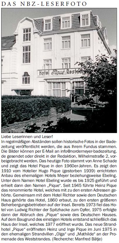 Das heutige Foto stammt von Anne Schade und zeigt das Hotel Pique in den 1960er-Jahren. Es zeigt den 1910 vom Hotelier Hugo Pique (gestorben 1939) errichteten Anbau des ehemaligen Hotels Meyer beziehungsweise Ebeling. Unter dem Namen Hotel Ebeling wurde es bis 1925 geführt und erhielt dann den Namen "Pique". Seit 1945 führte Heinz Pique das renommierte Hotel, welches mit zu den ersten Adressen gehörte. Gemeinsam mit dem Hotel Richter sowie dem Deutschen Haus gehörte das Hotel, 1860 erbaut, zu den ersten größeren Beherbergungsbetrieben auf der Insel. Bereits 1973 fiel das Hotel von Ludwig Richter der Spitzhacke zum Opfer, 1975 erfolgte dann der Abbruch des "Pique" sowie des Deutschen Hauses. Auf dem Baugrund des einstigen Hotels entstand schließlich das Haus der Insel, welches 1977 eröffnet wurde. Das neue Strandhotel "Pique" eröffneten Heinz und Inge Pique im Juni 1975 in den ehemaligen Strandvillen "Olga" und "Mathilde" an der Promenade des Weststrandes. (Recherche: Manfred Bätje)