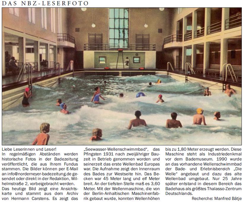 Das heutige Bild zeigt eine Ansichtskarte und stammt aus dem Archiv von Hermann Carstens. Es zeigt das "Seewasser-Wellenschwimmbad", das Pfingsten 1931 nach zweijähriger Bauzeit in Betrieb genommen worden und seinerzeit das erste Wellenbad Europas war. Die Aufnahme zeigt den Innenraum des Bades zur Westseite hin. Das Becken war 45 Meter lang und elf Meter breit. An der tiefsten Stelle maß es 3,60 Meter. Mit der Wellenmaschine, die von der Berlin-Anhaltischen Maschinenfabrik gebaut wurde, konnten Wellenhöhen bis zu 1,80 Meter erzeugt werden. Diese Maschine steht als Industriedenkmal vor dem Bademuseum. 1990 wurde an das vorhandene Wellenschwimmbad der Bade- und Erlebnisbereich "Die Welle" angebaut und dazu das alte Wellenbad umgebaut. Nur 25 Jahre später entstand in diesem Bereich das Badehaus als größtes Thalasso-Zentrum Deutschlands. Recherche: Manfred Bätje