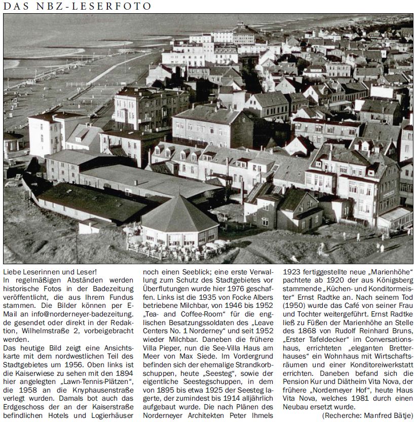 Das heutige Bild zeigt eine Ansichtskarte mit dem nordwestlichen Teil des Stadtgebietes um 1956. Oben links ist die Kaiserwiese zu sehen mit den 1894 hier angelegten "Lawn-Tennis-Plätzen", die 1958 an die Knyphausenstraße verlegt wurden. Damals bot auch das Erdgeschoss der an der Kaiserstraße befindlichen Hotels und Logierhäuser noch einen Seeblick; eine erste Verwallung zum Schutz des Stadtgebietes vor Überflutungen wurde hier 1976 geschaffen. Links ist die 1935 von Focke Albers betriebene Milchbar, von 1946 bis 1952 "Tea- and Coffee-Room" für die englischen Besatzungssoldaten des "Leave Centers No. Norderney" und seit 1952 wieder Milchbar. Daneben die frühere Villa Pieper, nun die See-Villa Haus am Meer von Max Siede. Im Vordergrund befinden sich der ehemalige Strandkorbschuppen, heute "Seesteg", sowie der eigentliche Seestegschuppen, in dem von 1895 bis etwa 1925 der Seesteg lagerte, der zumindest bis 1914 alljährlich aufgebaut wurde. Die nach Plänen des Norderneyer Architekten Peter Ihmels 1923 fertiggestellte neue "Marienhöhe" pachtete ab 1920 der aus Königsberg stammende "Küchen- und Konditormeister" Ernst Radtke an. Nach seinem Tod (1950) wurde das Café von seiner Frau und Tochter weitergeführt. Ernst Radtke ließ zu Füßen der Marienhöhe an Stelle des 1868 von Rudolf Reinhard Bruns, "Erster Tafeldecker" im Conversationshaus, errichteten "eleganten Bretterhauses" ein Wohnhaus mit Wirtschaftsräumen und einer Konditoreiwerkstatt errichten. Daneben befand sich die Pension Kur und Diätheim Vita Nova, der frühere "Norderneyer Hof", heute Haus Vita Nova, welches 1981 durch einen Neubau ersetzt wurde. (Recherche: Manfred Bätje)