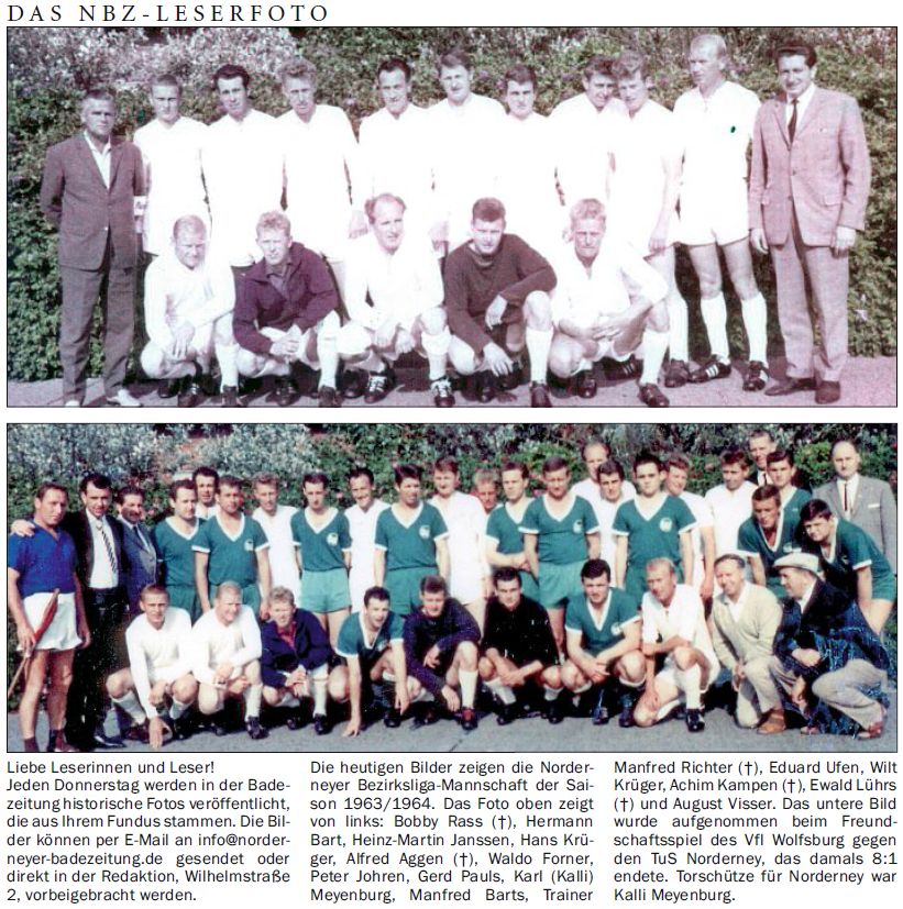 Die heutigen Bilder zeigen die Norderneyer Bezirksliga-Mannschaft der Saison 1963/1964. Das Foto oben zeigt von links: Bobby Rass (†), Hermann Bart, Heinz-Martin Janssen, Hans Krüger, Alfred Aggen (†) Waldo Forner, Peter Johren, Gerd Pauls, Karl (Kalli) Meyenburg, Manfred Barts, Trainer Manfred Richter (†), Eduard Ufen, Wilt Krüger, Achim Kampen (†), Ewald Lührs (†) und August Visser. Das untere Bild wurde aufgenommen beim Freundschaftsspiel des Vfl Wolfsburg gegen den TuS Norderney, das damals 8:1 endete. Torschütze für Norderney war Kalli Meyenburg.