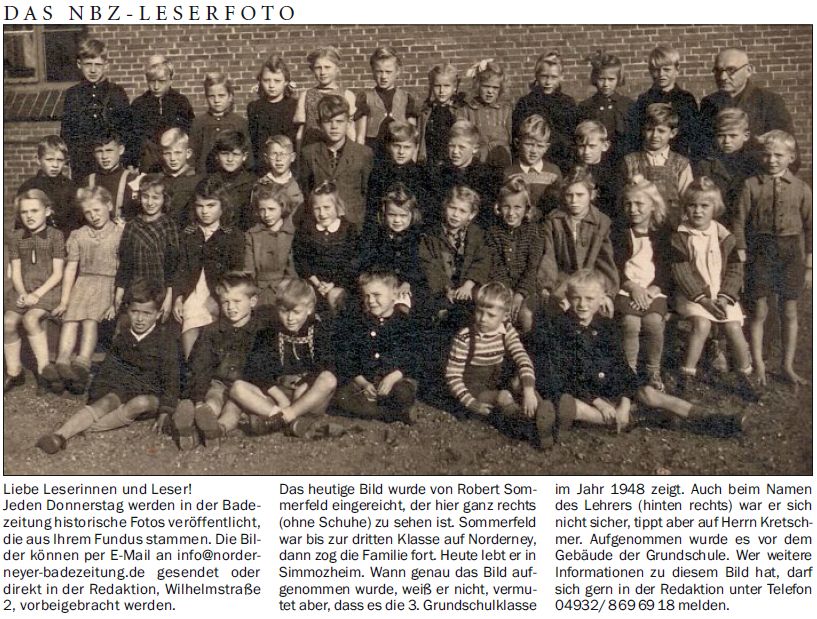 Das heutige Bild wurde von Robert Sommerfeld eingereicht, der hier ganz rechts (ohne Schuhe) zu sehen ist. Sommerfeld war bis zur dritten Klasse auf Norderney, dann zog die Familie fort. Heute lebt er in Simmozheim. Wann genau das Bild aufgenommen wurde, weiß er nicht, vermutet aber, dass es die 3. Grundschulklasse im Jahr 1948 zeigt. Auch beim Namen des Lehrers (hinten rechts) war er sich nicht sicher, tippt aber auf Herrn Kretschmer. Aufgenommen wurde es vor dem Gebäude der Grundschule. Wer weitere Informationen zu diesem Bild hat, darf sich gern in der Redaktion unter Telefon 04932/8696918 melden.