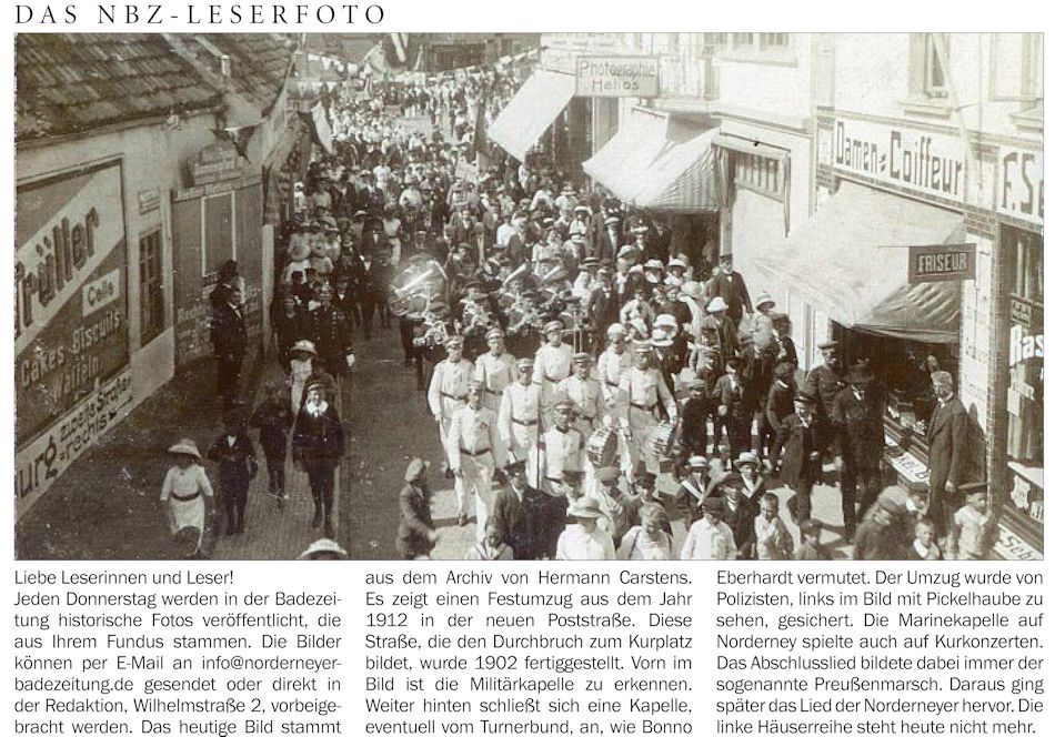 Das heutige Bild stammt aus dem Archiv von Hermann Carstens. Es zeigt einen Festumzug aus dem Jahr 1912 in der neuen Poststraße. Diese Straße, die den Durchbruch zum Kurplatz bildet, wurde 1902 fertiggestellt. Vorn im Bild ist die Militärkapelle zu erkennen. Weiter hinten schließt sich eine Kapelle, eventuell vom Turnerbund, an, wie Bonno Eberhardt vermutet. Der Umzug wurde von Polizisten, links im Bild mit Pickelhaube zu sehen, gesichert. Die Marinekapelle auf Norderney spielte auch auf Kurkonzerten. Das Abschlusslied bildete dabei immer der sogenannte Preußenmarsch. Daraus ging später das Lied der Norderneyer hervor. Die linke Häuserreihe steht heute nicht mehr.
