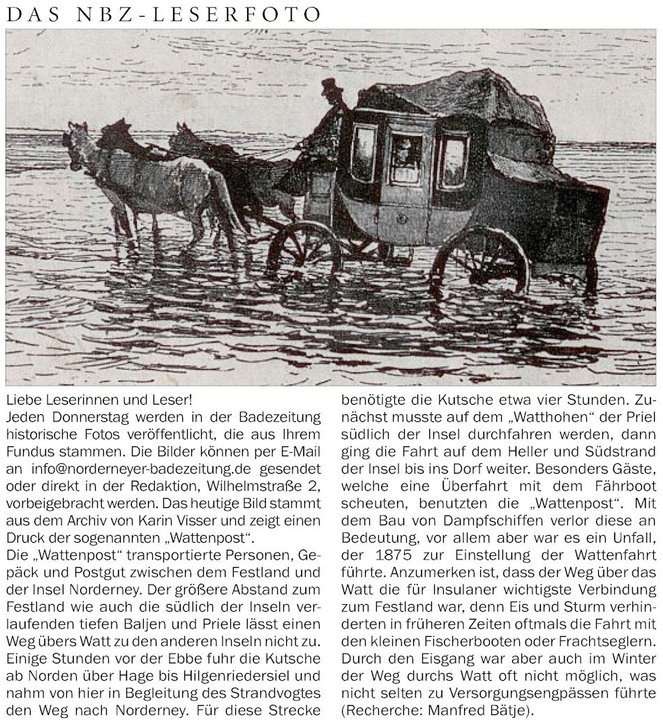 Das heutige Bild stammt aus dem Archiv von Karin Visser und zeigt einen Druck der sogenannten "Wattenpost". Die "Wattenpost" transportierte Personen, Gepäck und Postgut zwischen dem Festland und der Insel Norderney. Der größere Abstand zum Festland wie auch die südlich der Inseln verlaufenden tiefen Baljen und Priele lässt einen Weg übers Watt zu den anderen Inseln nicht zu. Einige Stunden vor der Ebbe fuhr die Kutsche ab Norden über Hage bis Hilgenriedersiel und nahm von hier in Begleitung des Strandvogtes den Weg nach Norderney. Für diese Strecke benötigte die Kutsche etwa vier Stunden. Zunächst musste auf dem "Watthohen" der Priel südlich der Insel durchfahren werden, dann ging die Fahrt auf dem Heller und Südstrand der Insel bis ins Dorf weiter. Besonders Gäste, welche eine Überfahrt mit dem Fährboot scheuten, benutzten die "Wattenpost". Mit dem Bau von Dampfschiffen verlor diese an Bedeutung, vor allem aber war es ein Unfall, der 1875 zur Einstellung der Wattenfahrt führte. Anzumerken ist, dass der Weg über das Watt die für Insulaner wichtigste Verbindung zum Festland war, denn Eis und Sturm verhinderten in früheren Zeiten oftmals die Fahrt mit den kleinen Fischerbooten oder Frachtseglern. Durch den Eisgang war aber auch im Winter der Weg durchs Watt oft nicht möglich, was nicht selten zu Versorgungsengpässen führte (Recherche: Manfred Bätje).
