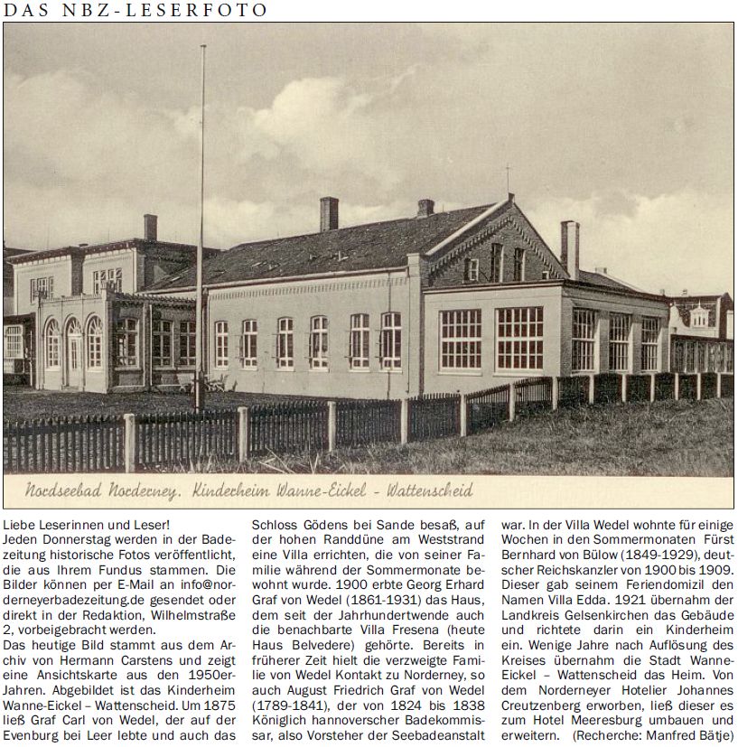 Das heutige Bild stammt aus dem Archiv von Hermann Carstens und zeigt eine Ansichtskarte aus den 1950er-Jahren. Abgebildet ist das Kinderheim Wanne-Eickel-Wattenscheid. Um 1875 ließ Graf Carl von Wedel, der auf der Evenburg bei Leer lebte und auch das Schloss Gödens bei Sande besaß, auf der hohen Randdüne am Weststrand eine Villa errichten, die von seiner Familie während der Sommermonate bewohnt wurde. 1900 erbte Georg Erhard Graf von Wedel (1861-1931) das Haus, dem seit der Jahrhundertwende auch die benachbarte Villa Fresena (heute Haus Belvedere) gehörte. Bereits in früherer Zeit hielt die verzweigte Familie von Wedel Kontakt zu Norderney, so auch August Friedrich Graf von Wedel (1789-1841), der von 1824 bis 1838 Königlich hannoverscher Badekommissar, also Vorsteher der Seebadeanstalt war. In der Villa Wedel wohnte für einige Wochen in den Sommermonaten Fürst Bernhard von Bülow (1849-1929), deutscher Reichskanzler von 1900 bis 1909. Dieser gab seinem Feriendomizil den Namen Villa Edda. 1921 übernahm der Landkreis Gelsenkirchen das Gebäude und richtete darin ein Kinderheim ein. Wenige Jahre nach Auflösung des Kreises übernahm die Stadt Wanne-Eickel-Wattenscheid das Heim. Von dem Norderneyer Hotelier Johannes Creutzenberg erworben, ließ dieser es zum Hotel Meeresburg umbauen und erweitern. (Recherche: Manfred Bätje)