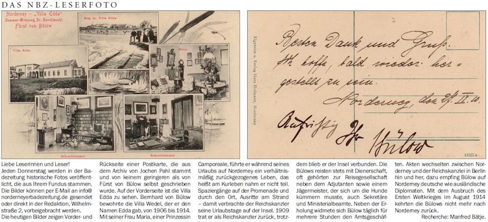 Die heutigen Bilder zeigen Vorder- und Rückseite einer Postkarte, die aus dem Archiv von Jochen Pahl stammt und von keinem geringeren als von Fürst von Bülow selbst geschrieben wurde. Auf der Vorderseite ist die Villa Edda zu sehen. Bernhard von Bülow bewohnte die Villa Wedel, der er den Namen Edda gab, von 1906 bis 1914. Mit seiner Frau Maria, einer Prinzessin Camporeale, führte er während seines Urlaubs auf Norderney ein verhältnismäßig zurückgezogenes Leben, das heißt am Kurleben nahm er nicht teil. Spaziergänge auf der Promenade und durch den Ort, Ausritte am Strand