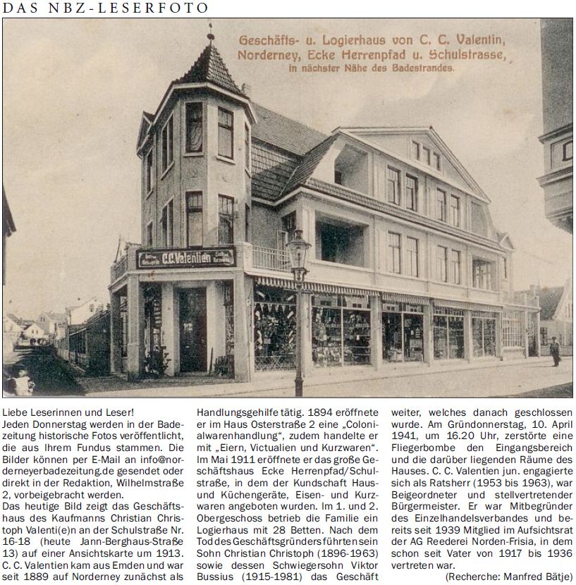 Das heutige Bild zeigt das Geschäftshaus des Kaufmanns Christian Christoph Valenti(e)n an der Schulstraße Nr. 16-18 (heute Jann-Berghaus-Straße 13) auf einer Ansichtskarte um 1913. C. C. Valentien kam aus Emden und war seit 1889 auf Norderney zunächst als Handlungsgehilfe tätig. 1894 eröffnete er im Haus Osterstraße 2 eine "Colonialwarenhandlung", zudem handelte er mit "Eiern, Victualien und Kurzwaren". Im Mai 1911 eröffnete er das große Geschäftshaus Ecke Herrenpfad/Schulstraße, in dem der Kundschaft Haus und Küchengeräte, Eisen- und Kurzwaren angeboten wurden. Im 1. und 2. Obergeschoss betrieb die Familie ein Logierhaus mit 28 Betten. Nach dem Tod des Geschäftsgründers führten sein Sohn Christian Christoph (1896-1963) sowie dessen Schwiegersohn Viktor Bussius (1915-1981) das Geschäft weiter, welches danach geschlossen wurde. Am Gründonnerstag, 10. April 1941, um 16.20 Uhr, zerstörte eine Fliegerbombe den Eingangsbereich und die darüber liegenden Räume des Hauses. C. C. Valentien jun. engagierte sich als Ratsherr (1953 bis 1963), war Beigeordneter und stellvertretender Bürgermeister. Er war Mitbegründer des Einzelhandelsverbandes und bereits seit 1939 Mitglied im Aufsichtsrat der AG Reederei Norden-Frisia, in dem schon seit Vater von 1917 bis 1936 vertreten war. (Recherche: Manfred Bätje)