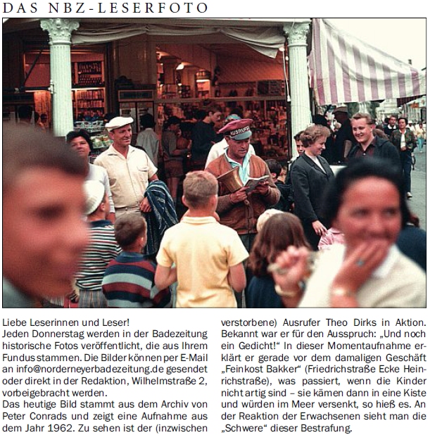 Das heutige Bild stammt aus dem Archiv von Peter Conrads und zeigt eine Aufnahme aus dem Jahr 1962. Zu sehen ist der (inzwischen verstorbene) Ausrufer Theo Dirks in Aktion. Bekannt war er für den Ausspruch: "Und noch ein Gedicht!" In dieser Momentaufnahme erklärt er gerade vor dem damaligen Geschäft "Feinkost Bakker" (Friedrichstraße Ecke Heinrichstraße), was passiert, wenn die Kinder nicht artig sind - sie kämen dann in eine Kiste und würden im Meer versenkt, so hieß es. An der Reaktion der Erwachsenen sieht man die "Schwere" dieser Bestrafung.