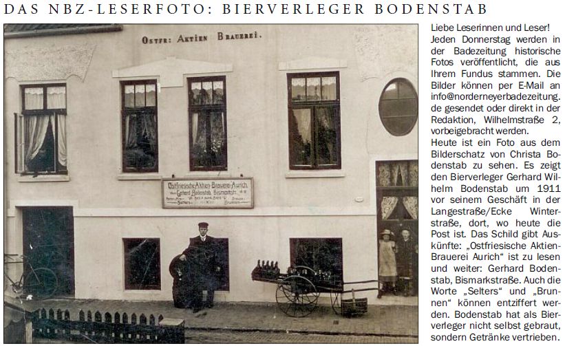 Heute ist ein Foto aus dem Bilderschatz von Christa Bodenstab zu sehen. Es zeigt den Bierverleger Gerhard Wilhelm Bodenstab um 1911 vor seinem Geschäft in der Langestraße/Ecke Winterstraße, dort, wo heute die Post ist. Das Schild gibt Auskünfte: "Ostfriesische Aktien-Brauerei Aurich" ist zu lesen und weiter: Gerhard Bodenstab, Bismarkstraße. Auch die Worte "Selters" und "Brunnen" können entziffert werden. Bodenstab hat als Bierverleger nicht selbst gebraut, sondern Getränke vertrieben.