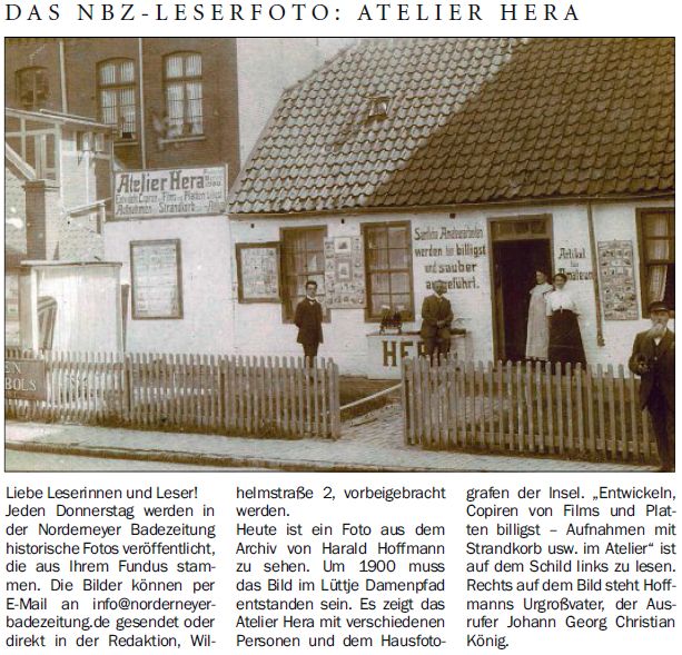 Heute ist ein Foto aus dem Archiv von Harald Hoffmann zu sehen. Um 1900 muss das Bild im Lüttje Damenpfad entstanden sein. Es zeigt das Atelier Hera mit verschiedenen Personen und dem Hausfotografen der Insel. "Entwickeln, Copiren von Films und Platten billigst - Aufnahmen mit Strandkorb usw. im Atelier" ist auf dem Schild links zu lesen. Rechts auf dem Bild steht Hoffmanns Urgroßvater, der Ausrufer Johann Georg Christian König.