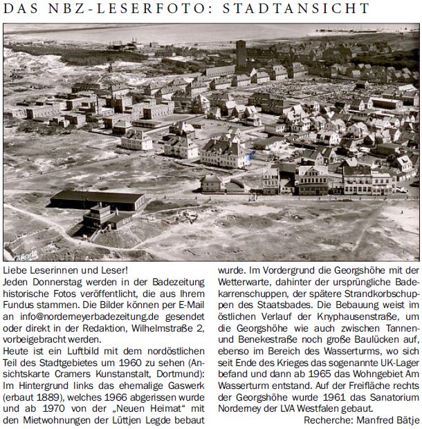 Heute ist ein Luftbild mit dem nordöstlichen Teil des Stadtgebietes um 1960 zu sehen (Ansichtskarte Cramers Kunstanstalt, Dortmund): Im Hintergrund links das ehemalige Gaswerk (erbaut 1889), welches 1966 abgerissen wurde und ab 1970 von der "Neuen Heimat" mit den Mietwohnungen der Lüttjen Legde bebaut wurde. Im Vordergrund die Georgshöhe mit der Wetterwarte, dahinter der ursprüngliche Badekarrenschuppen, der spätere Strandkorbschuppen des Staatsbades. Die Bebauung weist im östlichen Verlauf der Knyphausenstraße, um die Georgshöhe wie auch zwischen Tannen- und Benekestraße noch große Baulücken auf, ebenso im Bereich des Wasserturms, wo sich seit Ende des