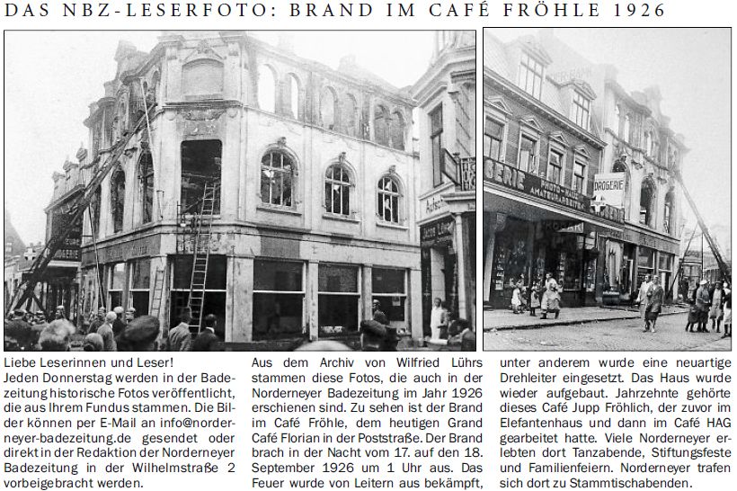 Aus dem Archiv von Wilfried Lührs stammen diese Fotos, die auch in der Norderneyer Badezeitung im Jahr 1926 erschienen sind. Zu sehen ist der Brand im Café Fröhle, dem heutigen Grand Café Florian in der Poststraße. Der Brand brach in der Nacht vom 17. auf den 18. September 1926 um 1 Uhr aus. Das Feuer wurde von Leitern aus bekämpft, unter anderem wurde eine neuartige Drehleiter eingesetzt. Das Haus wurde wieder aufgebaut. Jahrzehnte gehörte dieses Café Jupp Fröhlich, der zuvor im Elefantenhaus und dann im Café HAG gearbeitet hatte. Viele Norderneyer erlebten dort Tanzabende, Stiftungsfeste und Familienfeiern. Norderneyer trafen sich dort zu Stammtischabenden.