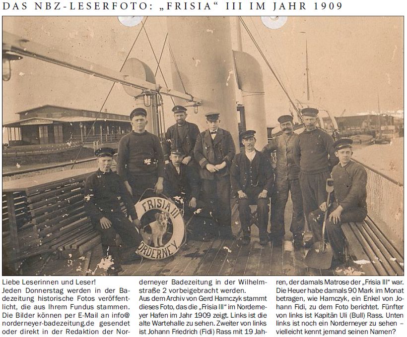 Aus dem Archiv vonGerd Hamczyk stammt dieses Foto, das die "Frisia III" im Norderneyer Hafen im Jahr 1909 zeigt. Links ist die alte Wartehalle zu sehen. Zweiter von links ist Johann Friedrich (Fidi) Rass mit 19 Jahren, der damals Matrose der "Frisia III"war. Die Heuer habe damals 90 Mark im Monat betragen, wie Hamczyk, ein Enkel von Johann Fidi, zu dem Foto berichtet. Fünfter von links ist Kapitän Uli (Bull) Rass. Unten links ist noch ein Norderneyer zu sehen - vielleicht kennt jemand seinen Namen?