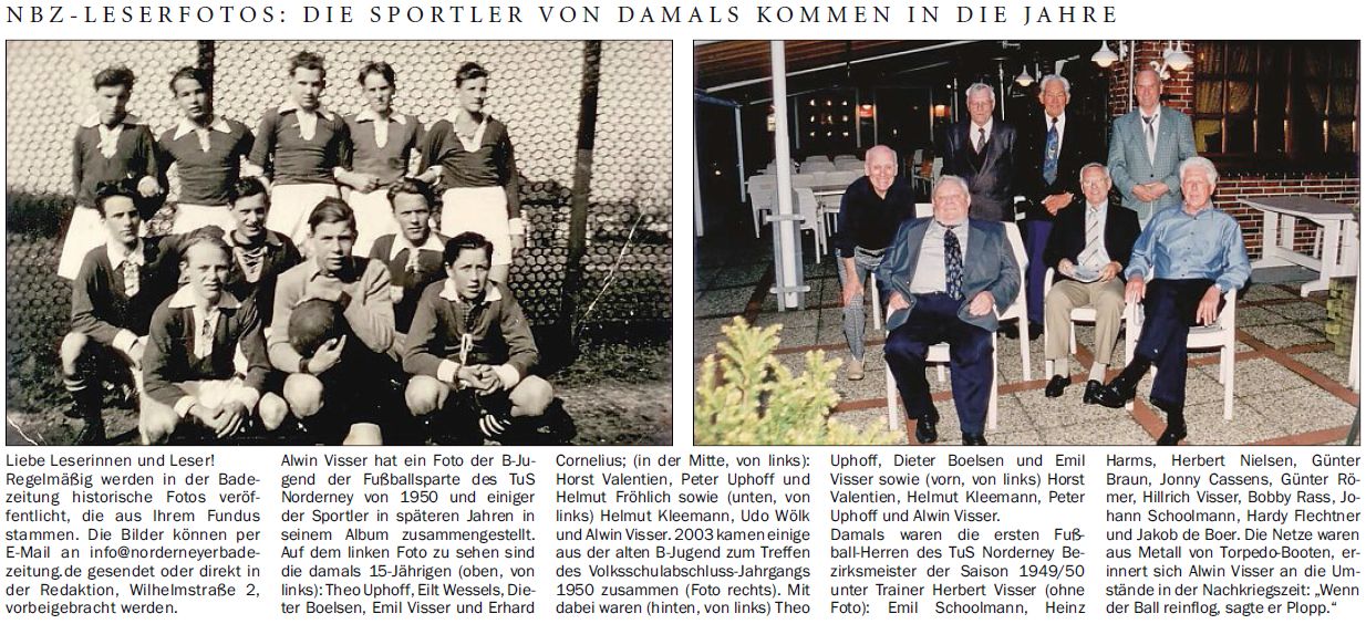 Alwin Visser hat ein Foto der B-Jugend der Fußballsparte des TuS Norderney von 1950 und einiger der Sportler in späteren Jahren in seinem Album zusammengestellt. Auf dem linken Foto zu sehen sind die damals 15-Jährigen (oben, von links): Theo Uphoff, Eilt Wessels, Dieter Boelsen, Emil Visser und Erhard Cornelius; (in der Mitte, von links): Horst Valentien, Peter Uphoff und Helmut Fröhlich sowie (unten, von links) Helmut Kleemann, Udo Wölk und Alwin Visser. 2003 kamen einige aus der alten B-Jugend zum Treffen des Volksschulabschluss-Jahrgangs 1950 zusammen (Foto rechts). Mit dabei waren (hinten, von links) Theo Uphoff, Dieter Boelsen und Emil Visser sowie (vorn, von links) Horst Valentien, Helmut Kleemann, Peter Uphoff und Alwin Visser. Damals waren die ersten Fußball-Herren des TuS Norderney Bezirksmeister der Saison 1949/50 unter Trainer Herbert Visser (ohne Foto): Emil Schoolmann, Heinz Harms, Herbert Nielsen, Günter Braun, Jonny Cassens, Günter Römer, Hillrich Visser, Bobby Rass, Johann Schoolmann, Hardy Flechtner und Jakob de Boer. Die Netze waren aus Metall von Torpedo-Booten, erinnert sich Alwin Visser an die Umstände in der Nachkriegszeit: "Wenn der Ball reinflog, sagte er Plopp."