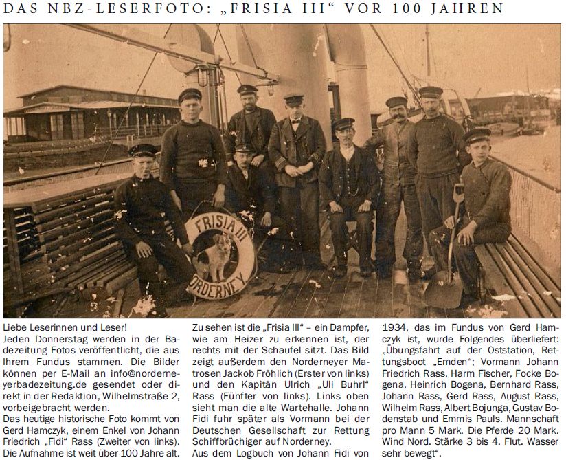 Das heutige historische Foto kommt von Gerd Hamczyk, einem Enkel von Johann Friedrich "Fidi" Rass (Zweiter vonl inks). Die Aufnahme ist weit über100 Jahre alt. Zu sehen ist die "Frisia III" - ein Dampfer, wie am Heizer zu erkennen ist, der rechts mit der Schaufel sitzt. Das Bild zeigt außerdem den Norderneyer Matrosen Jackob Fröhlich (Erster von links) und den Kapitän Ulrich "Uli Buhrl" Rass (Fünfter von links). Links oben sieht man die alte Wartehalle. Johann Fidi fuhr später als Vormann bei der Deutschen Gesellschaft zur Rettung Schiffbrüchiger auf Norderney. Aus dem Logbuch von Johann Fidi von 1934, das im Fundus von Gerd Hamczyk ist, wurde Folgendes überliefert: "Übungsfahrtauf der Oststation, Rettungsboot "Emden"; Vormann Johann Friedrich Rass, Harm Fischer, Focke Bogena, Heinrich Bogena, Bernhard Rass, Johann Rass, Gerd Rass, August Rass, Wilhelm Rass, Albert Bojunga, Gustav Bodenstab und Emmis Pauls. Mannschaft pro Mann 5 Mark. Die Pferde 20 Mark. Wind Nord. Stärke 3 bis 4. Flut. Wasser sehr bewegt".