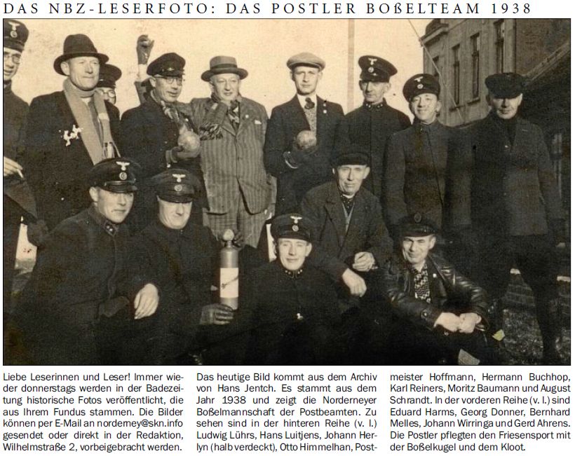 Das heutige Bild kommt aus dem Archiv von Hans Jentch. Es stammt aus dem Jahr 1938 und zeigt die Norderneyer Boßelmannschaft der Postbeamten. Zu sehen sind in der hinteren Reihe (v.l.) Ludwig Lührs, Hans Luitjens, Johann Herlyn (halb verdeckt), Otto Himmelhan, Postmeister Hoffmann, Hermann Buchhop, Karl Reiners, Moritz Baumann und August Schrandt. In der vorderen Reihe (v.l.) sind Eduard Harms, Georg Donner, Bernhard Melles, Johann Wirringa und Gerd Ahrens. Die Postler pflegten den Friesensport mit der Boßelkugel und dem Kloot.