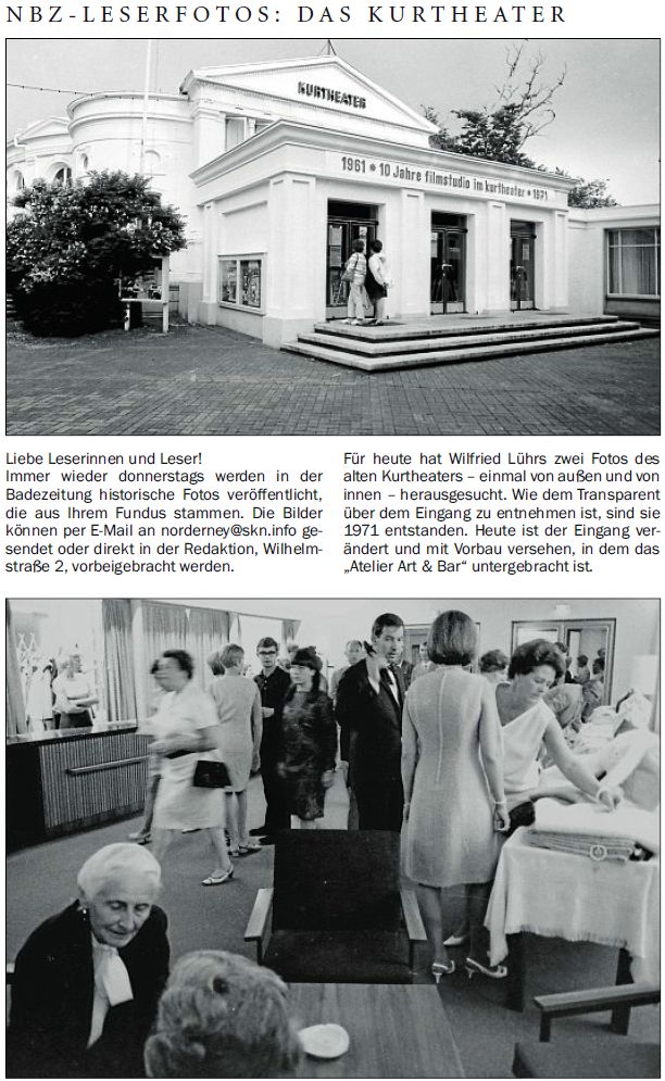 Für heute hat Wilfried Lührs zwei Fotos des alten Kurtheaters - einmal von außen und von innen - herausgesucht. Wie dem Transparent über dem Eingang zu entnehmen ist, sind sie 1971 entstanden. Heute ist der Eingang verändert und mit Vorbau versehen, in dem das "Atelier Art & Bar" untergebracht ist.