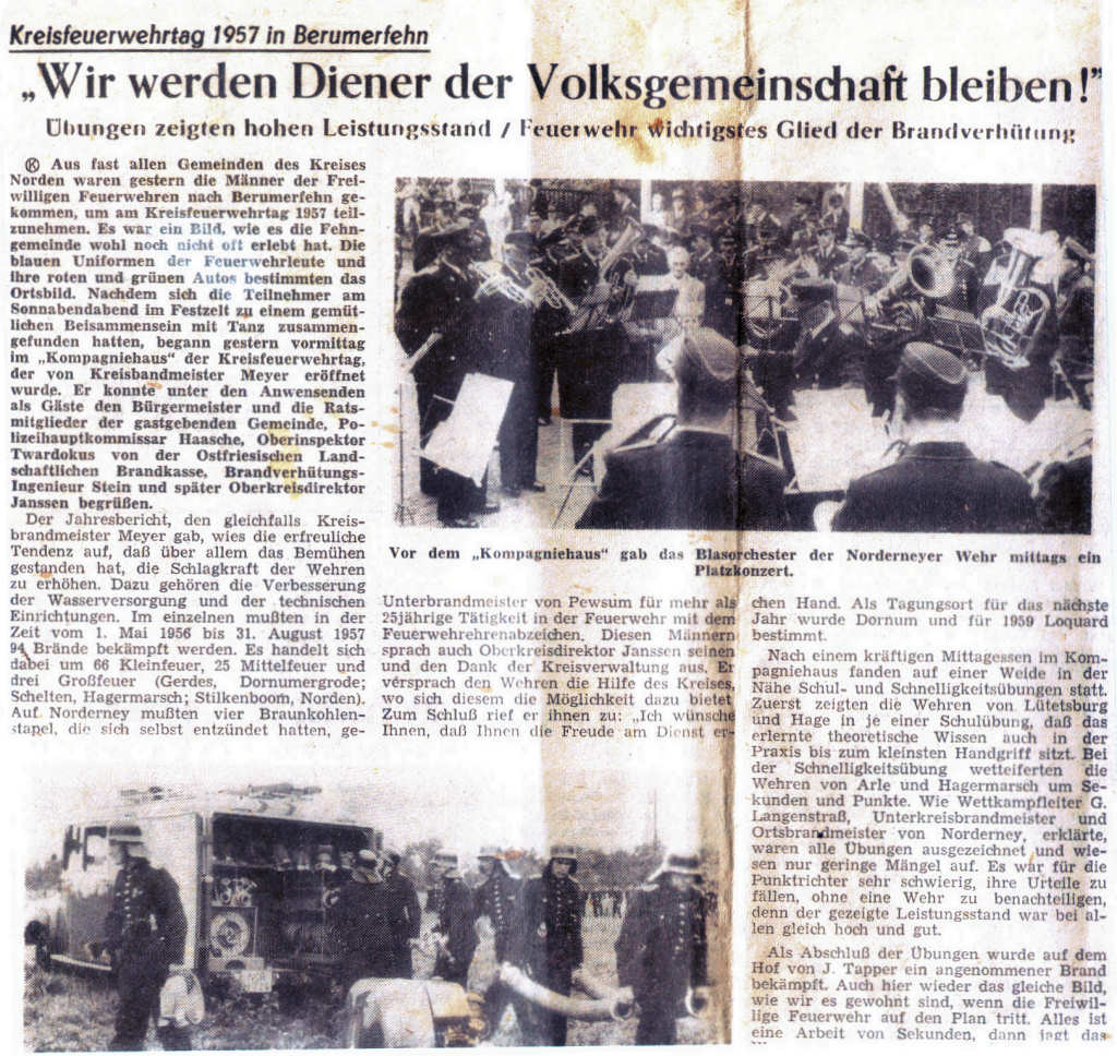 Beachte bitte: Sämtliche Norderneyer Blasmusiker haben neue Uniformröcke bekommen, auch neue Hosen mit roten Bisen. Der Stellv. Wehrführer G. Langenstraß, war auf dem Kreisfeuerwehrtag sehr stolz, auf seine Musiker. Leider war der Wehrführer Johann Extra erkrankt. Kamerad Langenstraß war auch Wettkampfleiter.
