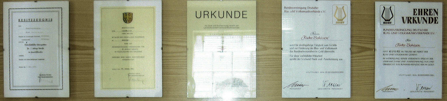 Es gibt einen, Kamerad Fokke Bohlsen (Frisiastr.) hat in seiner 50.jährigen Dienstzeit sämtliche Festabzzeichen, wo der Spielmannszug daran Zeigegenommen hat, in einer Schatulle gesammelt. Auch seine, im Laufe der Zeit erhaltene Urkunden der Feuerwehr, hängen in seiner Veranda an der Glasbausteinwand.