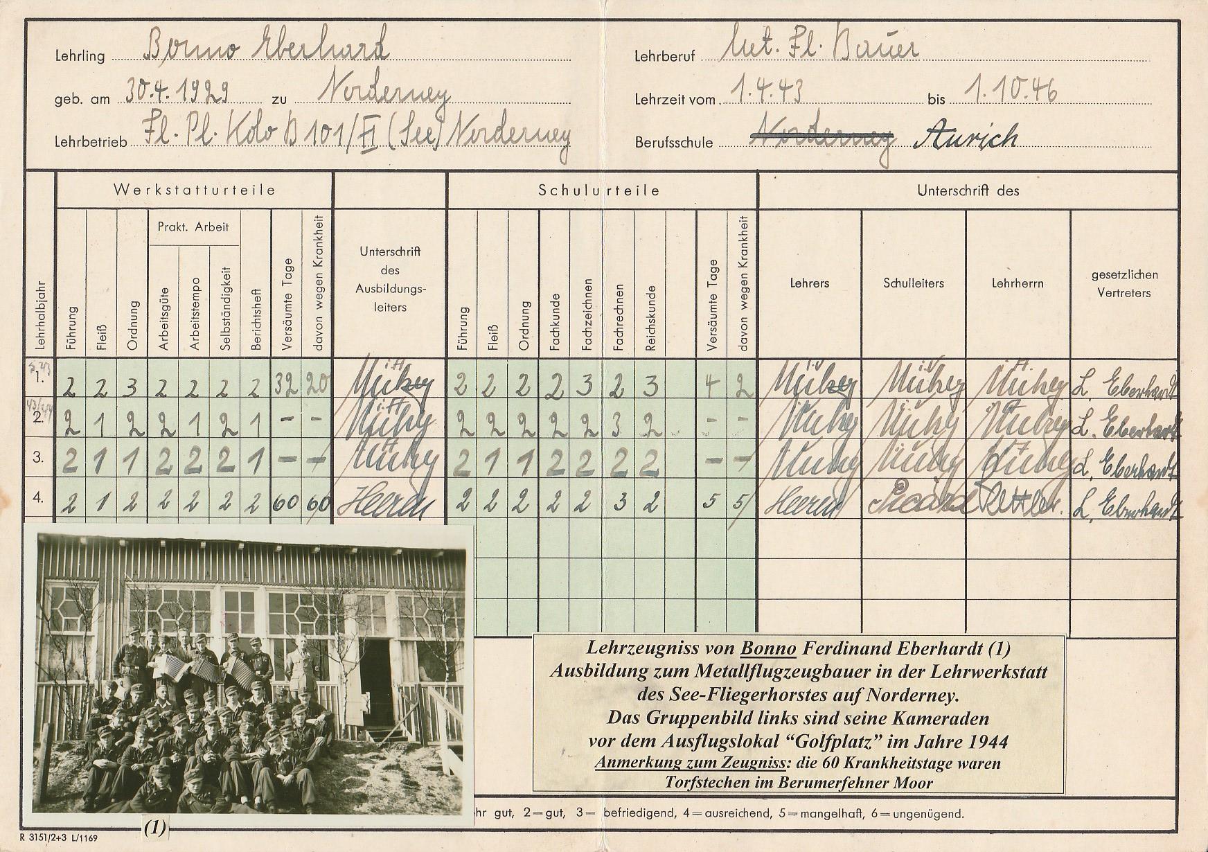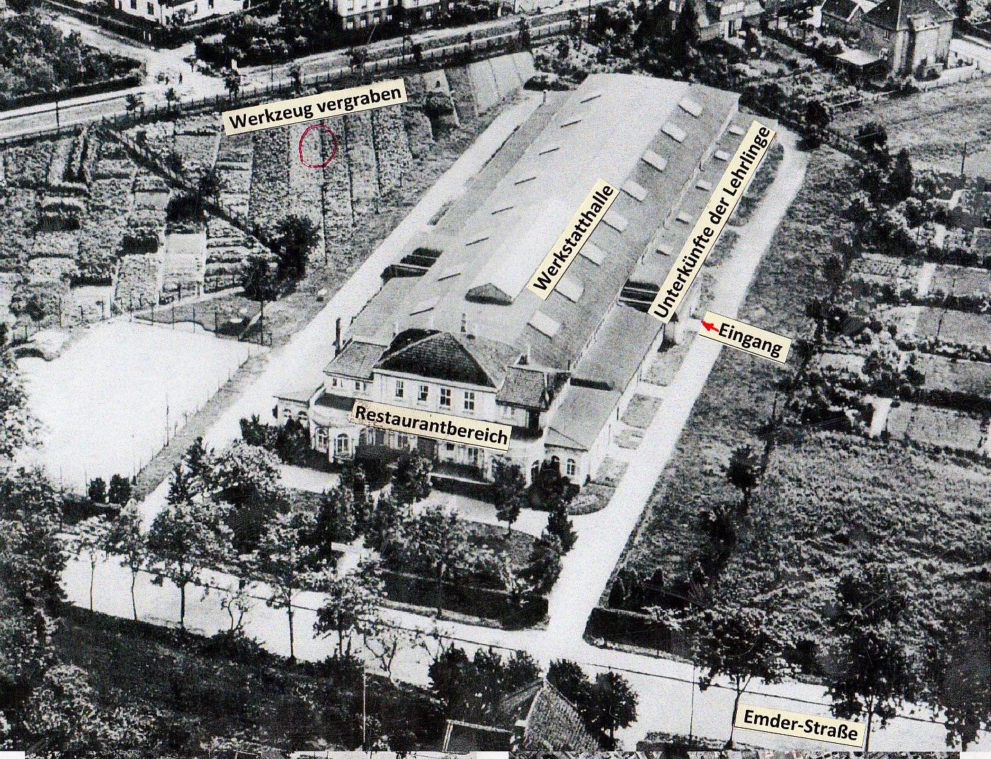 In der Auricher Zeit unserer Lehre mussten wir Lehrlinge unsere Segelfliegerprüfungen A. in Hellberge bei Hamburg und B. in Gardelegen bei Berlin absolvieren. Während der Rückreise Anfang April 1945 von Gardelegen nach Aurich sagten uns auf dem Hannover Bahnhof Soldaten, die von der Front kamen: Jungs geht nach Hause, der Krieg ist bald vorbei. In Aurich wieder angekommen, merkten wir sofort, dass zwischen unserem Vorgesetzten eine gedrückte Stimmung herrschte. An einem Vormittag Mitte April hieß es: Ihr müsst heute ein tiefes Loch im Garten links neben der Halle, graben. Den Garten mussten wir sowieso bearbeiten, denn das Gemüse und die Kartoffeln wurden für die Eigenverpflegung gebraucht. Nachdem das Loch ausgegraben war, wurden alle wertvollen Messgeräte, wie Schieblehren, Mikrometerschrauben und Sonstige Kleinwerkzeuge in Ölpapier eingewickelt und sorgfältig in das Loch gelegt und mit dem Erdaushub wieder zugeschüttet. Alles wurde wieder Gartenmäßig hergerichtet. In den Rundfunknachrichten hörten wir, dass die Engländer und Kanadier in Ostfriesland einmarschiert sind. Unser Schulleiter Heeren gab uns zu verstehen, dass der Krieg im Endstadium sei, und die Lehrwerkstatt wird geschlossen, ab morgen geht ihr nach Haus.