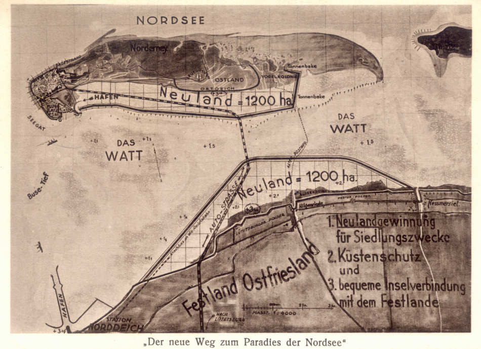 Offensichtlich aus den 1920/1930er-Jahren stammt eine alte, hier abgebildete Postkarte, die unter dem Titel "Der neue Weg zum Paradies der Nordsee" für den Bau einer Autostraße zwischen dem Festland und der Insel warb. Die Trasse sollte zwischen Norddeich und Hilgenriedersiel beginnen, auf der Insel südöstlich vom Leuchtturm enden und von dort zum Hafen führen. Um die Wattfläche für den Straßenbau zwischen der Küste und der Insel zu verengen und zu verringern, planten die Initiatoren sowohl im Küstenbereich als auch an der Südseite der Insel die Gewinnung von Neuland "für Siedlungszwecke". Die vom Staatlichen Nordseebad Norderney herausgegebene Karte forderte - wie auf der Rückseite vermerkt ist -die Benutzer auf, "dieses deutsche Kulturwerk" zu unterstützen. Die Vervielfältigungsrechte für die Postkarte lagen bei einer "Terrain- und Straßengesellschaft Norderney, Postfach 16".