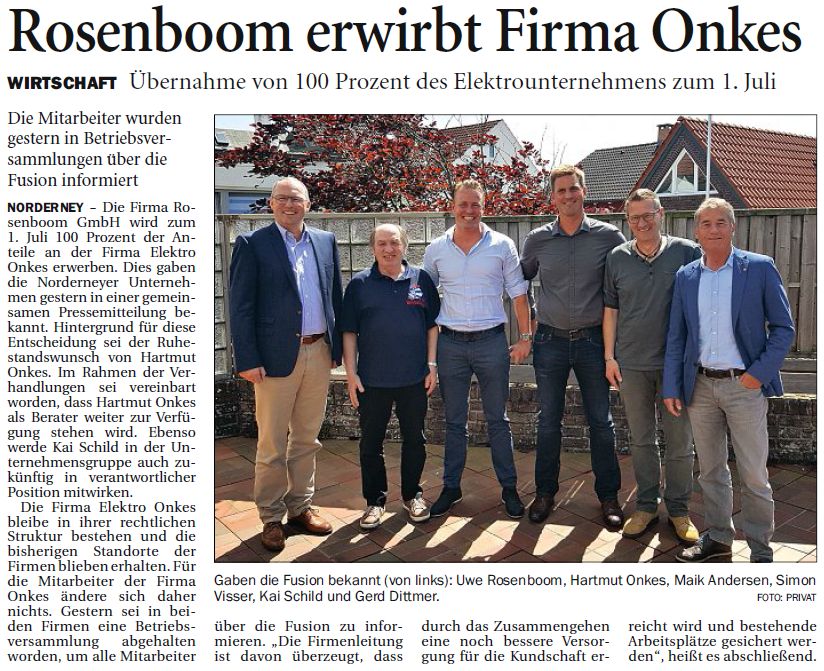 Die Firma Rosenboom erwirbt zum 1. Juli 100 Prozent der Anteile der Firma Elektro Onkes.