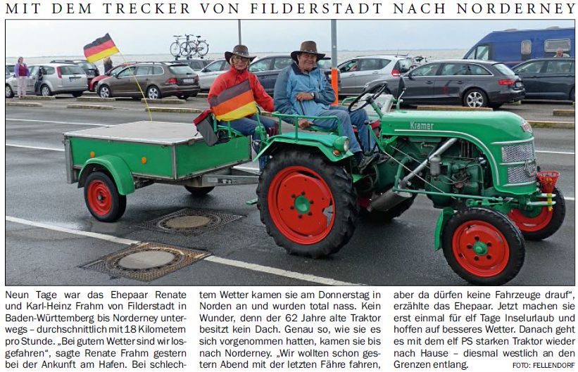 Mit durchschnittlich 18 Kilometern pro Stunde reist das Ehepaar Renate und Karl-Heinz Frahm von Filderstadt in Baden-Württemberg mit einem 62 Jahre alten Traktor nach Norderney.