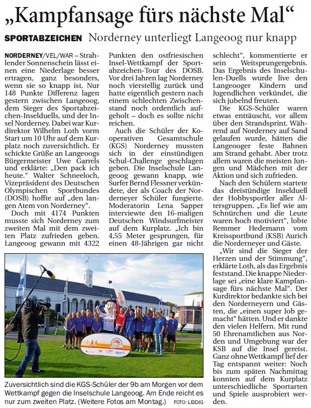 Mit 4.322 Punkten gewinnt Langeoog auch das zweite Inselduell um die Abnahme des Deutschen Sportabzeichens vor Norderney mit 4.174 Punkten.