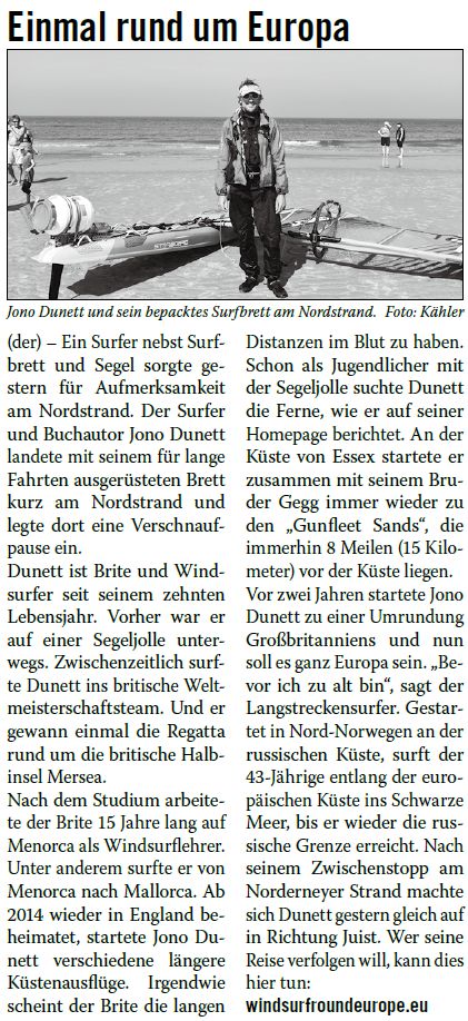 Surfer Jono Dunett legt mit seinem für lange Fahrten ausgerüsteten Brett eine Verschnaufpause am Nordstrand ein. Er will auf dem Surfbrett Europa umrunden.