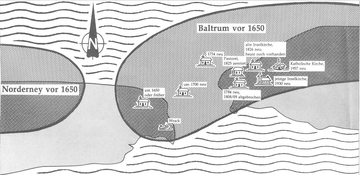 Die älteste bekannte Kirche der ostfriesischen Insel Baltrum - um 1650 oder früher erbaut - stand auf dem östlichen Teil des heute zu Norderney gehörenden Territoriums. Das ist aus den erhalten gebliebenen Kirchenakten aus dieser Zeit nachzuweisen. Die Dokumente befinden sich im Staatsarchiv Aurich.