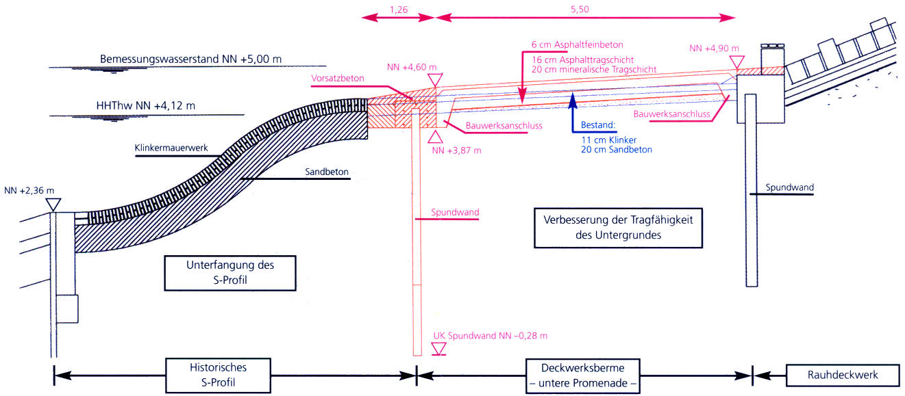 wird mit der Verstärkung der unteren Promenade und der Sanierung des "S-Profiles" der 2. Bauabschnitt am Nordbad in Angriff genommen. Nachdem zuvor die Tragfähigkeit des Untergrundes verbessert wurde, kann der abgängige, alte Belag durch ein farblich dem roten Klinker des S-Profiles angepassten gut begehbaren Asphaltbeton ersetzt werden. Das historische "S-Profil" wird durch eine Spundwand abgefangen und alle Hohlräume unter dem alten Teil werden schrittweise durch Schlämmverfahren und mit einer Feinzementinjektage beseitigt. Nach dieser grundlegenden Verstärkung des Unterbaues wird das Klinkermauerwerk saniert und als historisches Küstenschutzbauwerk erhalten.
