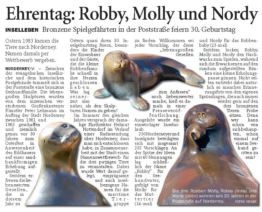 Zwischen der evangelischen Inselkirche und dem historischen Postgebäude tummelt sich in der Poststraße eine bronzene Seehundfamilie. Die lebensgroßen Skulpturen wurden von dem inzwischen verstorbenen Großenknetener Künstler Peter Lehmann im Auftrag der Stadt Norderney zwischen 1981 und 1983 geschaffen und ziemlich genau vor 30 Jahren zum Osterfest in Anwesenheit des Bildhauers auf einer sandbankförmigen Erhebung aufgestellt.